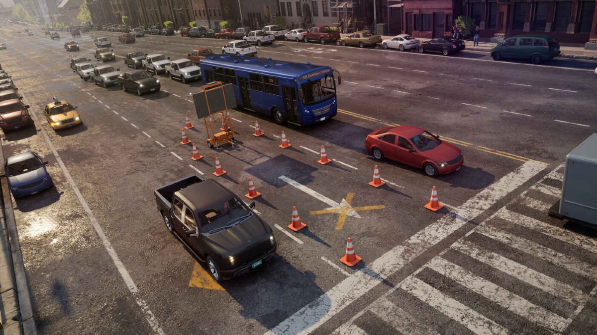The game features a fully simulated inhabited town that features traffic systems, dynamic day/night, and weather systems.