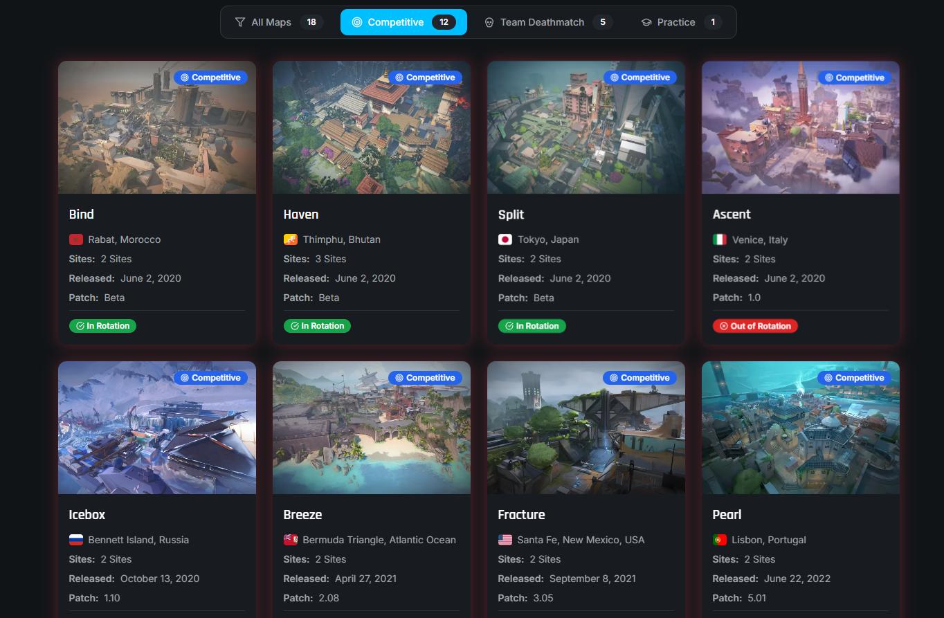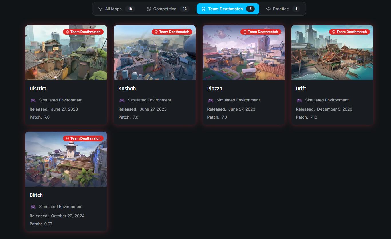 Team Deathmatch maps follow a different release strategy entirely. Riot launched three TDM maps simultaneously on June 27, 2023, followed by additional releases with Drift in December 2023 and Glitch in October 2024. This batched approach makes sense for shorter, less complex arenas that don’t require the same strategic investment as full competitive maps.