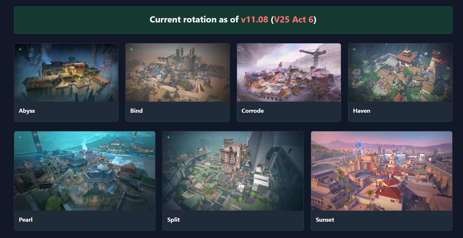 The competitive rotation received its most recent shake-up with patch 11.08 in September 2025. Ascent and Lotus left the active pool while Pearl and Split returned. This change aligned with Season 2025 Act 6’s launch on October 16, creating a competitive environment featuring Abyss, Bind, Corrode, Haven, Pearl, Split, and Sunset.