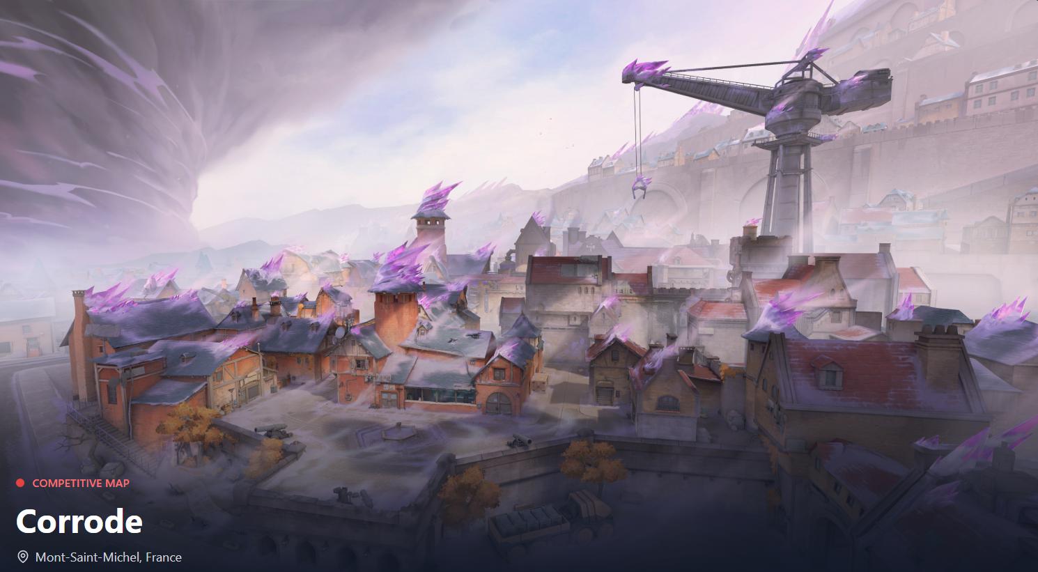 Corrode arrived on June 25, 2025, representing Riot’s latest experiment in blending historical aesthetics with tactical gameplay. This French-inspired battleground transforms a medieval castle town into an industrial radianite salt mining facility, creating what appears to be Mont-Saint-Michel reimagined for competitive play.