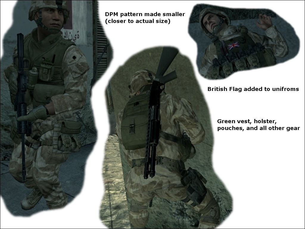 An update to Tri-Tard's British DPM Camo Skins. This version adds some realism tweaks, adding actual accessories used by the soldiers.