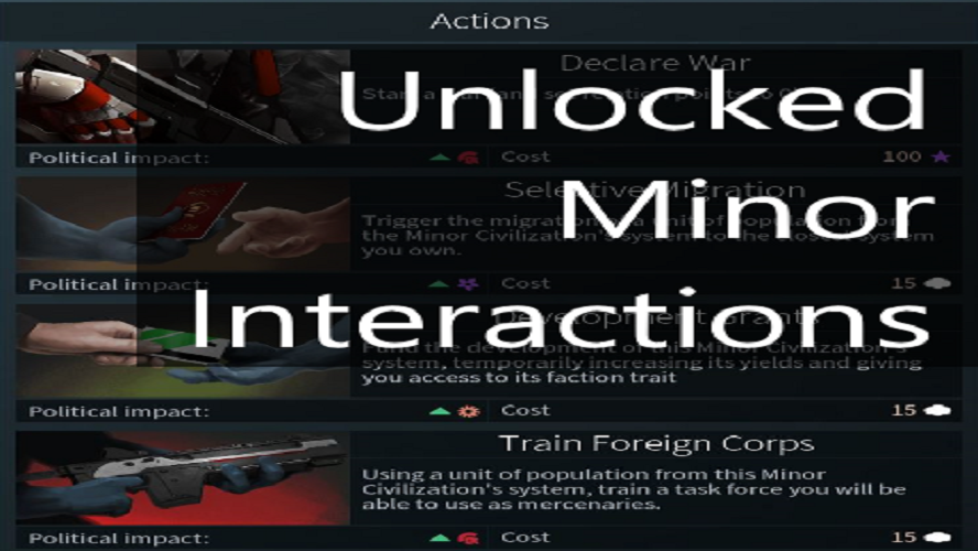 You might notice that all minor factions in Endless Space 2 are classed as Pacifist, Pragmatist or Warmonger, and this affects what Suzerain actions you can take with them: Selective Migration, Development Grants or Train Foreign Corps. This mod takes that limitation off. With it, you'll be able to access all Suzerain actions with any Minor Faction, provided you hold the highest appeal to be able to act as their Suzerain.