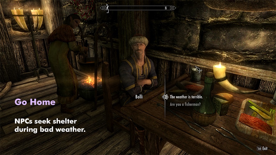 This mod is multifunctional. Simply put, it adds numerous visual, auditory, and AI effects based upon weather. Has a character gotten wet? Then the water will drip off of them. Is it cold? You'll see their breath. Is there a blizzard? Then it will be hard for you and them to see and the wind will howl. Of course if the weather's bad, they might just go inside like a sane person would. With this mod, a lot of appropriate properties come into play regarding behavior and physical effects with the weather.