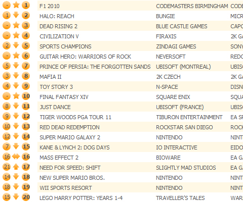 Bungie’s Halo: Reach has been nudged by the arrival of Codemasters’ F1 2010 racer. Capcom’s Dead Rising 2 bites Mafia II for 3rd place.