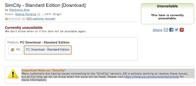 The game is listed as ”Currently Unavailable: We don’t know when or if this item will be available again,” with the later explanation, ”Many customers are having issues connecting to the “SimCity” servers. EA is actively working to resolve these issues, but at this time we do not know when the issue will be fixed. Please visit https://help.ea.com/en/simcity/simcity for more information.”
