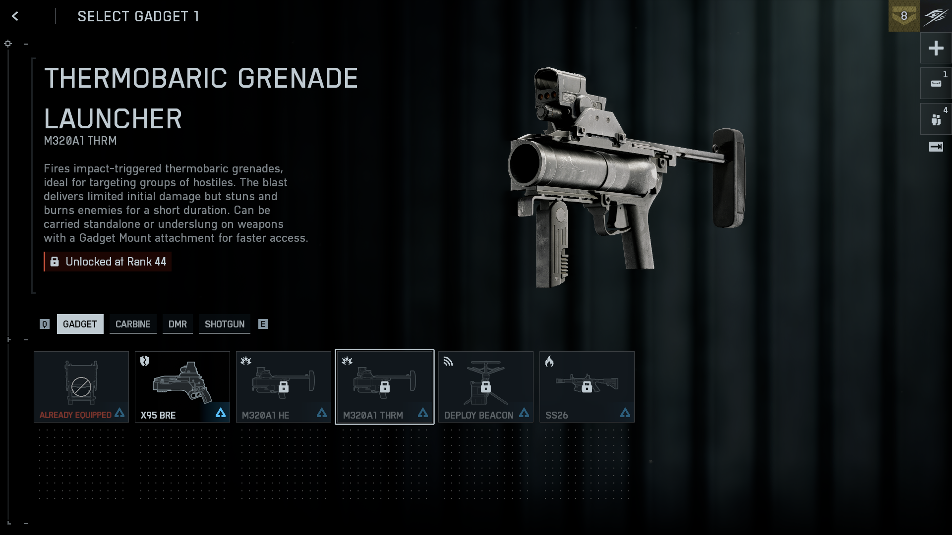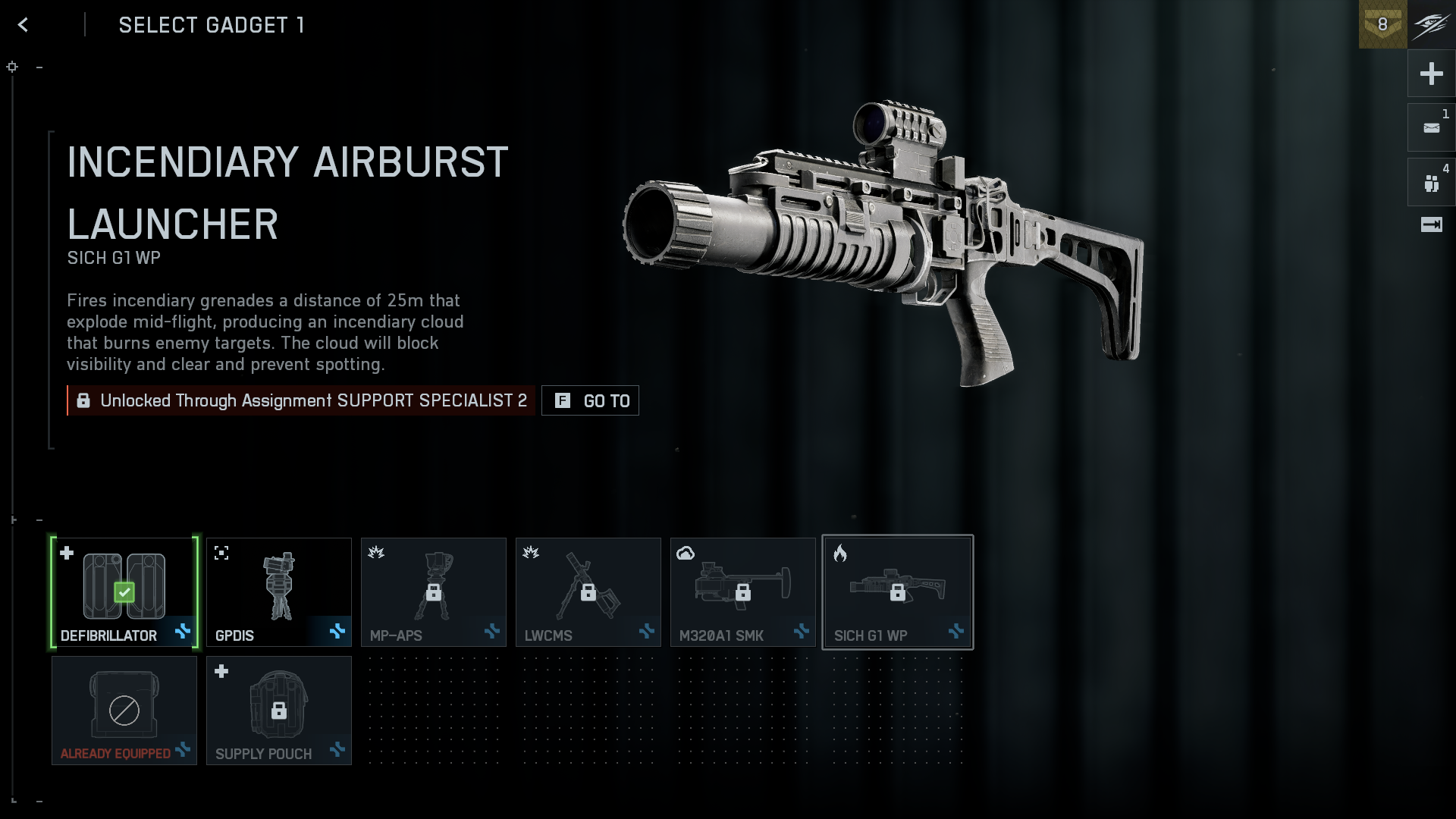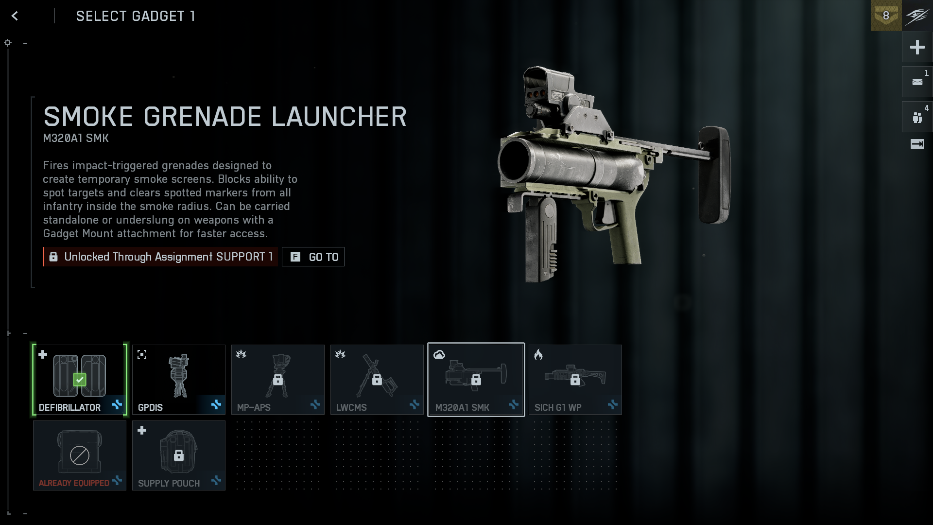 A launcher similar to those of the Assault class that shoots impact-triggered smoke grenades. Can also be attached to weapons in a smaller version.
