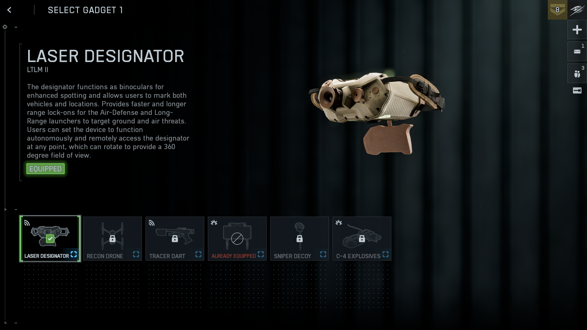 Binocular-shaped designator that can mark both vehicles and locations. It boosts the speed and range of lock-ons for friendly defense and launcher systems. It can also be planted and function autonomously.