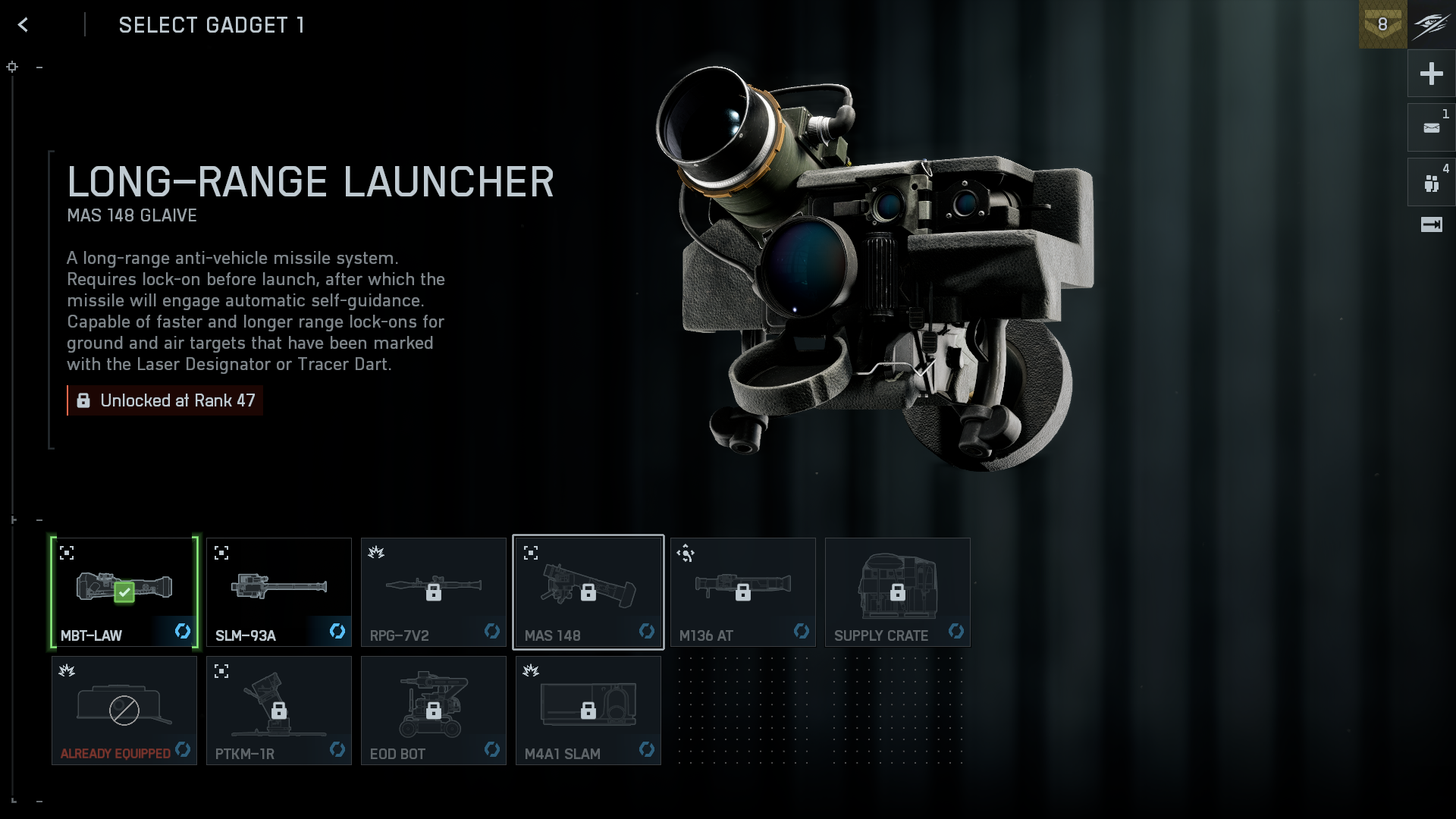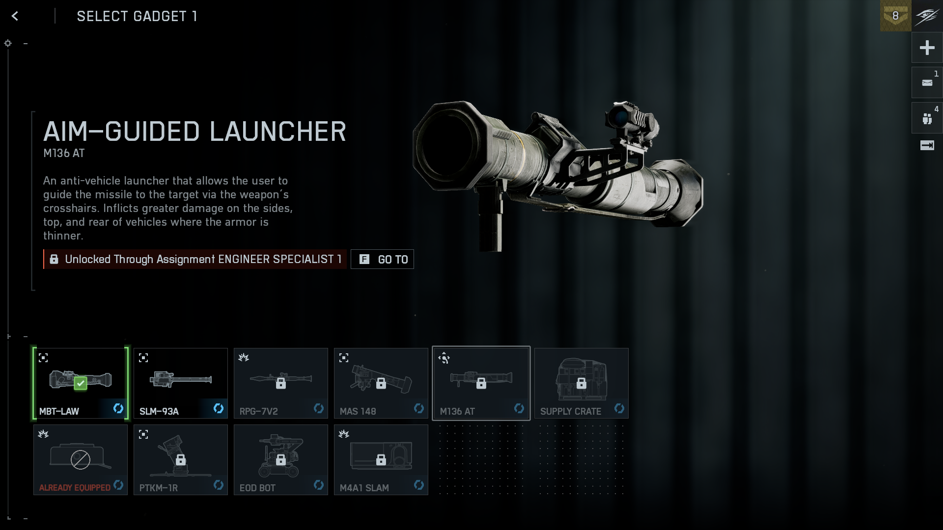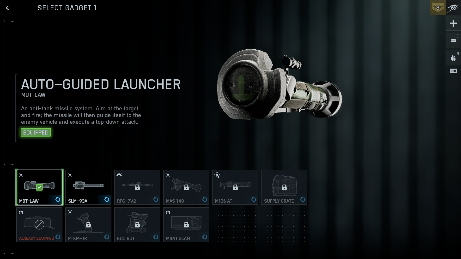 A traditional anti-vehicle launcher which lets the user guide the missile to the target. Also deals extra damage to the sides, top, and rear of vehicles.