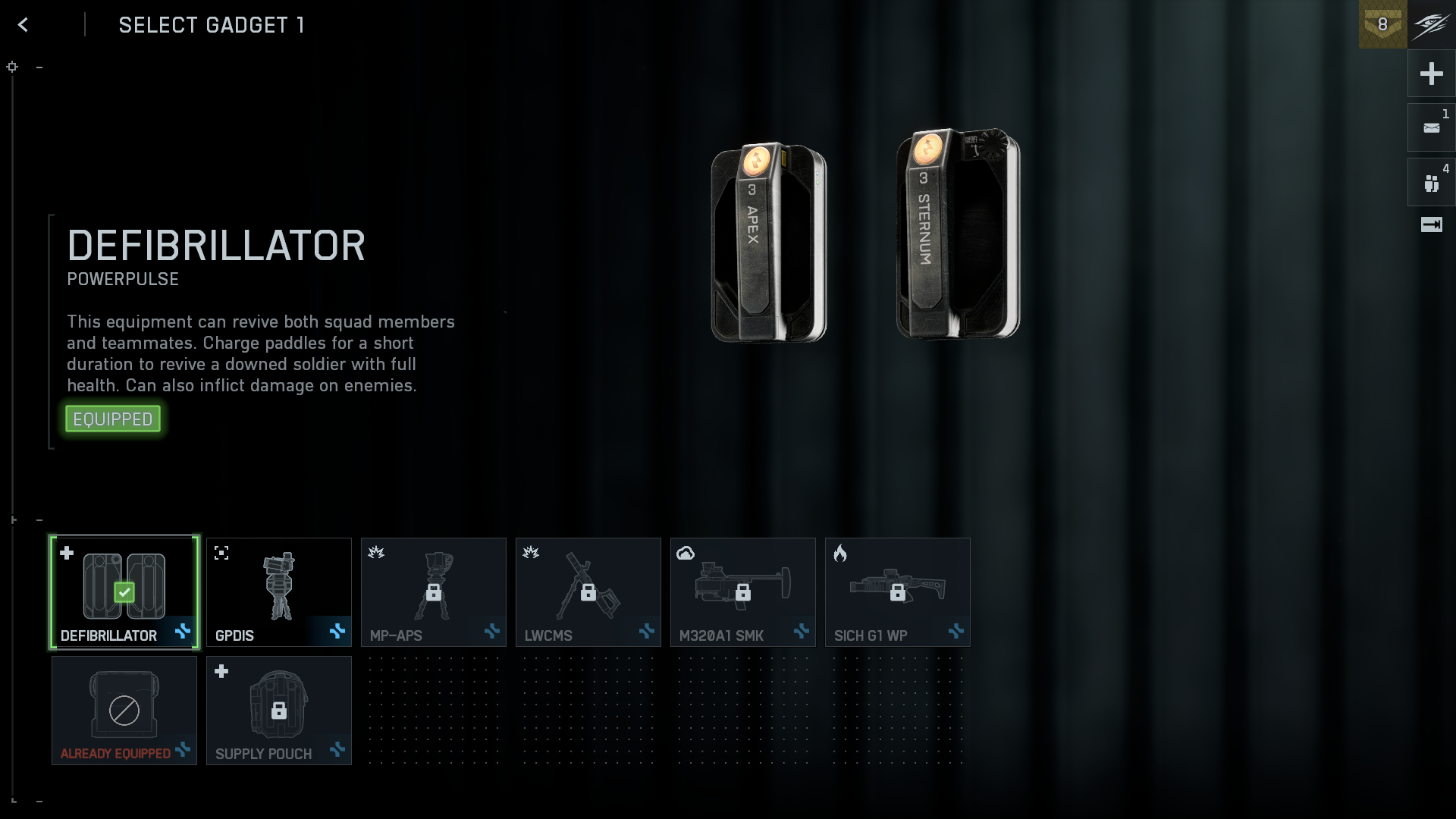A traditional piece of equipment of the Support class which can instantly revive squad members and teammates. A few shocks will also down enemies, so it can used as an improvised melee weapon.