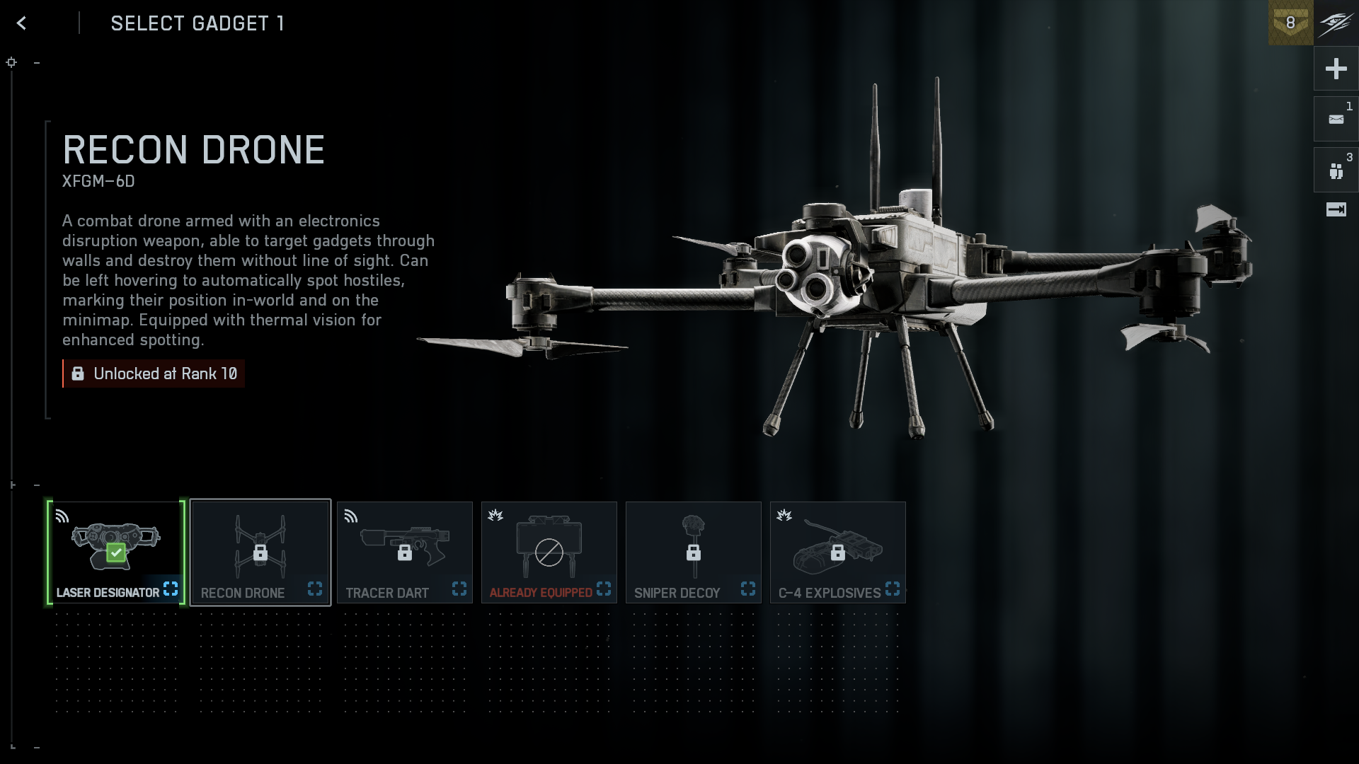 A small combat drone armed with an electronics disruption weapon that can destroy gadgets through walls. It can also hover on its own and spot hostiles, and features a thermal vision option.