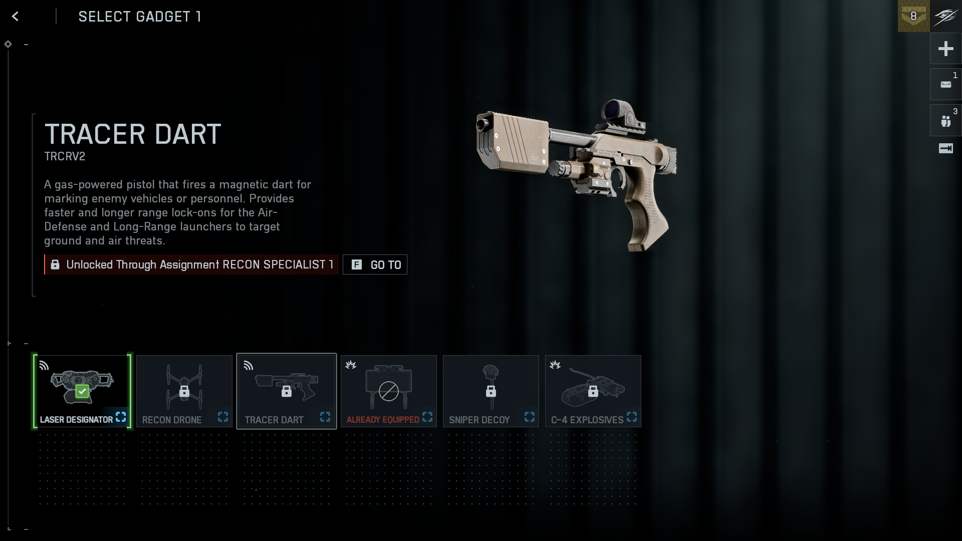 A gas-powered pistol which fires a magnetic dart capable of marking vehicles and personnel. The darts boost the range and lock-ons of the air-defense and long-range launchers.