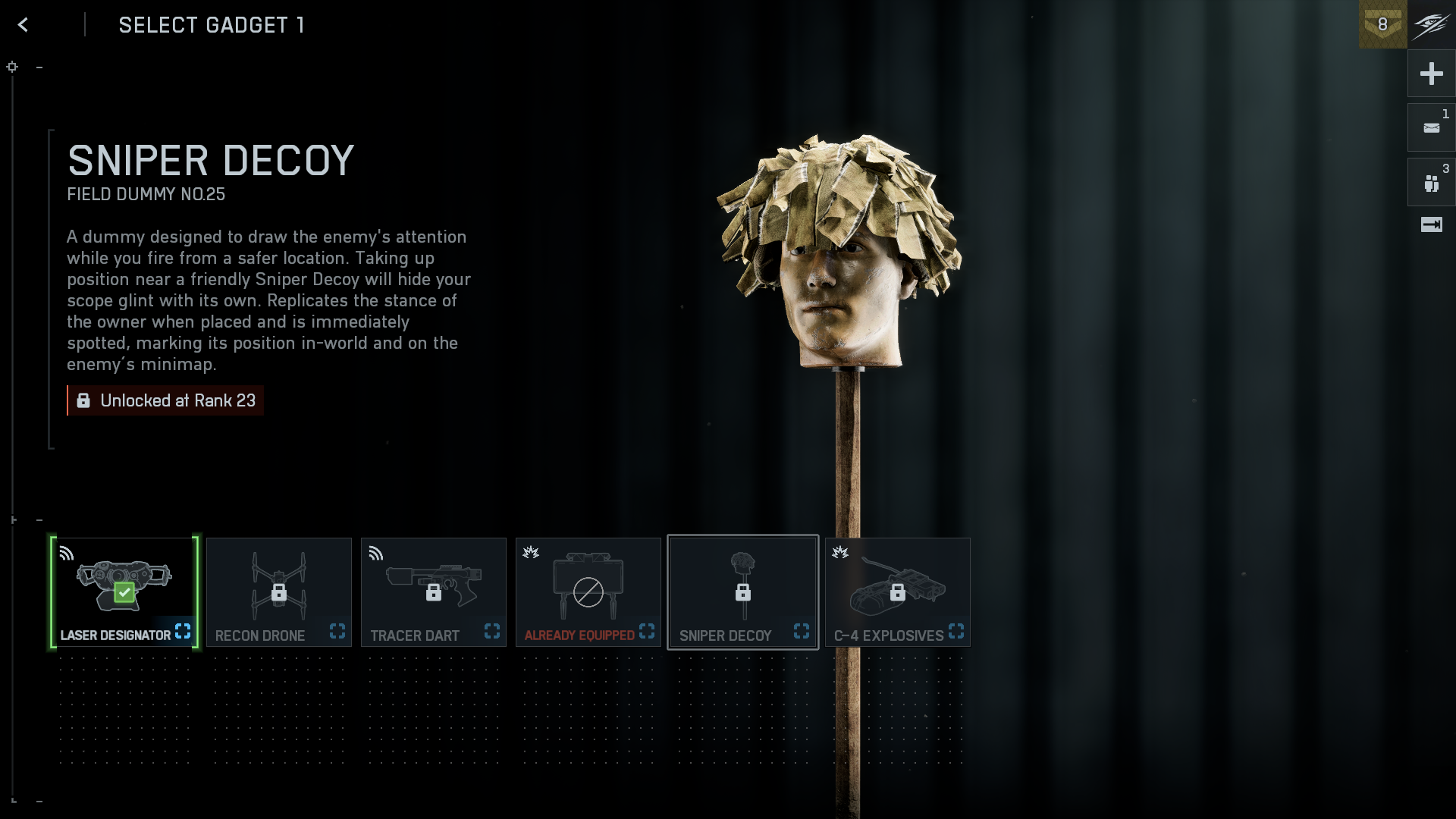 A rubber dummy which draws the enemy attention and hides the Recon soldier’s scope glint with one of its own. It also replicates the stance of the owner and is marked on the enemy minimap.