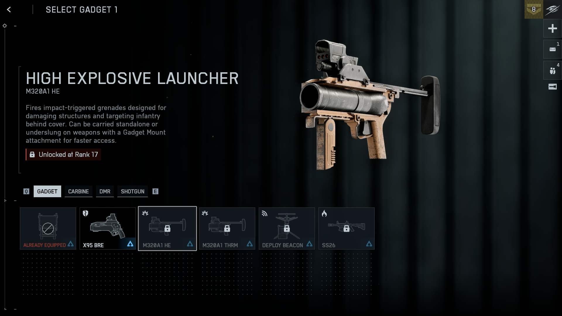 The high explosive launcher is a BF classic which fires grenades that explode on impact, damaging both structures and infantry. This is the standalone version; some weapons can use an attachment version of the same gadget.