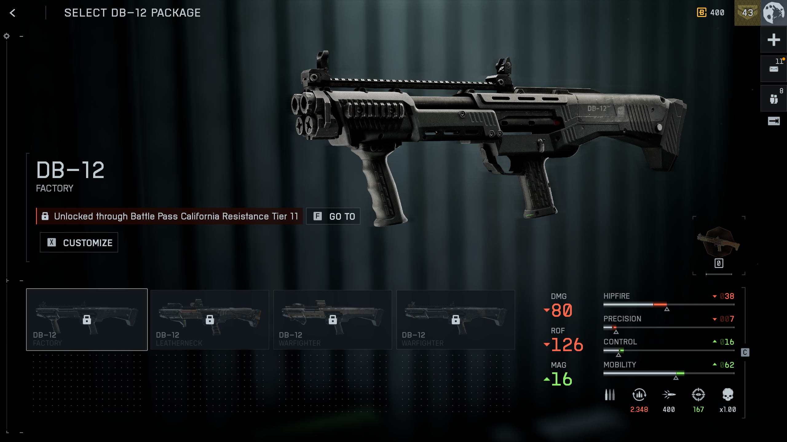 - DB-12 - A double-barrel shotgun with pump action which enables quick follow-up shots if the target doesn’t fall right away. With a 16-shell default mag, soldiers can spray and pray.