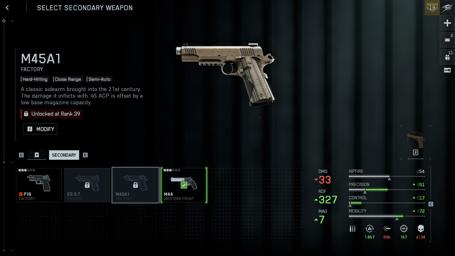 - M45A1 - A traditional sidearm adapted to the 21st century. Its decent damage and rate of fire are offset by a small magazine.