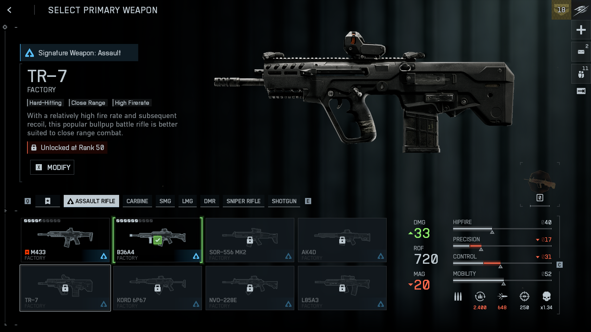 - TR-7 - A popular bullpup battle rifle with a high rate of fire and recoil better suited to close-range combat.