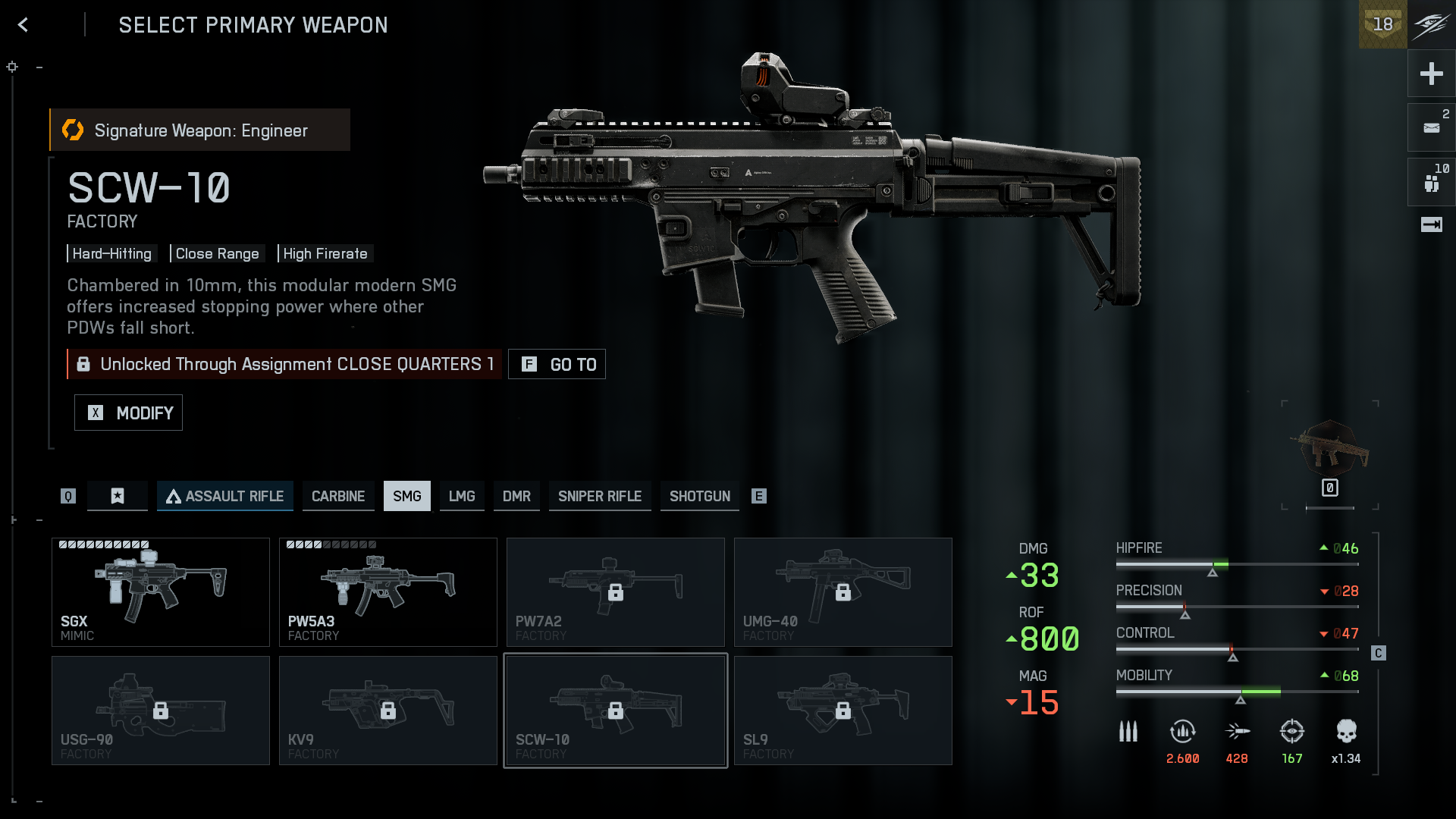 - SCW-10 - A modular modern SMG chambered in 10mm with increased stopping power for better performance in mid-range encounters.