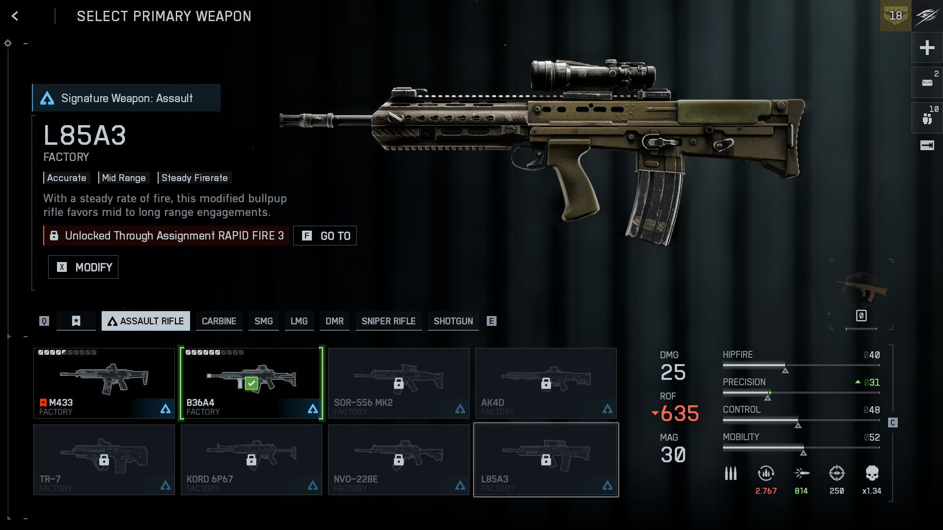 - L85A3 - A modified bullpup rifle with a steady rate of fire that favors mid-to-long rage engagements.
