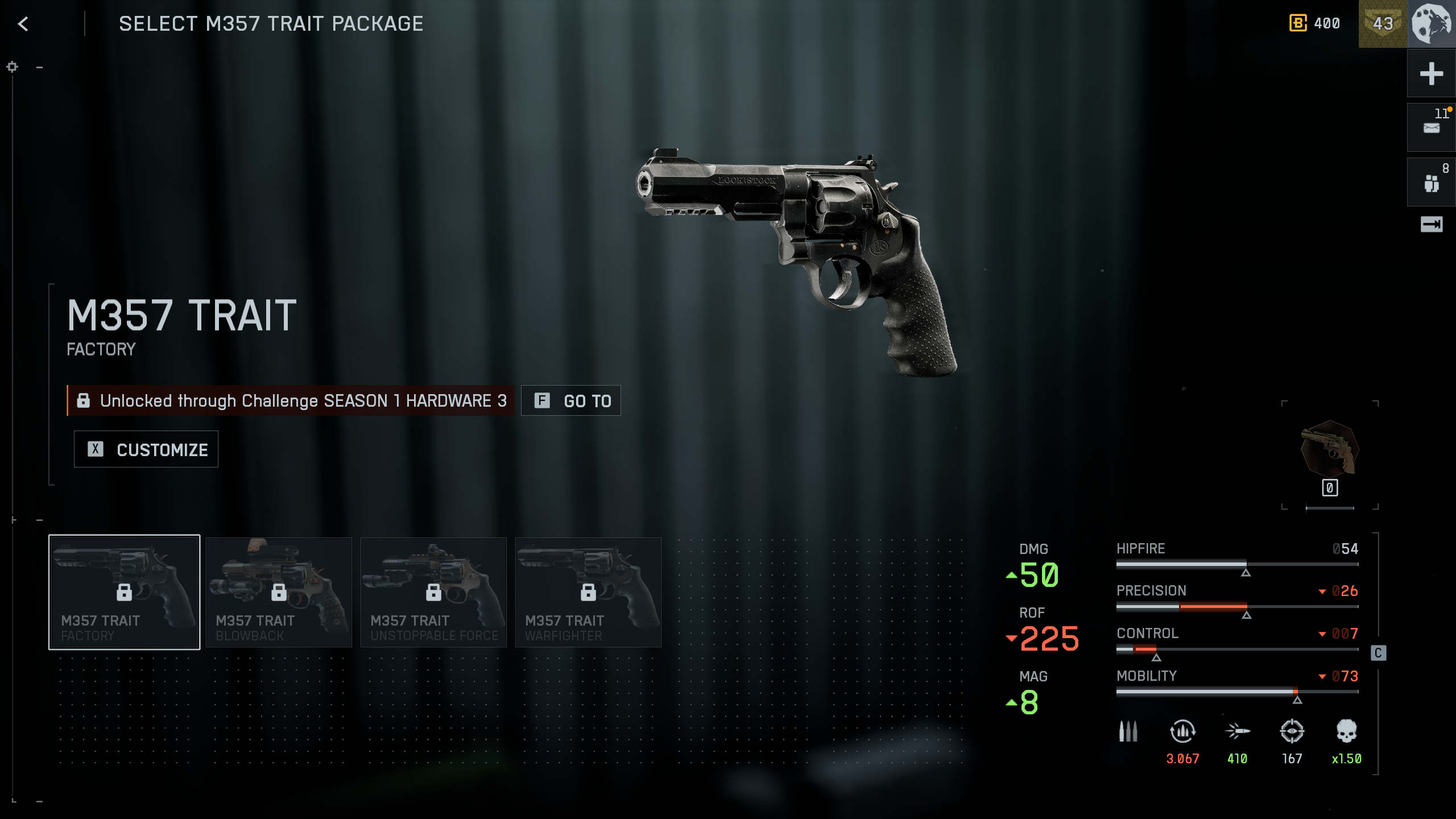 - M357 Trait - The game’s second revolver. In this case, a lightweight one with a 8-shot cylinder and a selection of very flexible attachments.