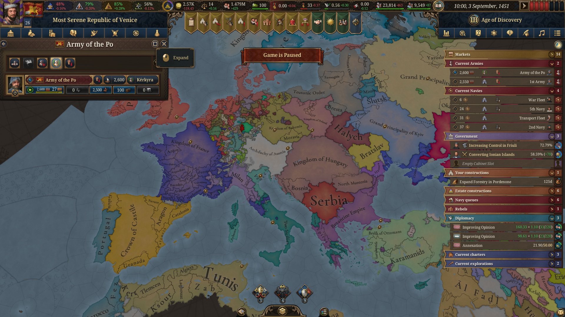 One recurring complaint regarding Europa Universalis V’s UI was tied to the sheer amount of alerts that would appear at the top of the screen fairly early on in a playthrough. They always came back after being dismissed, which is why the Rossbach update 1.1 will allow us to permanently mute them.