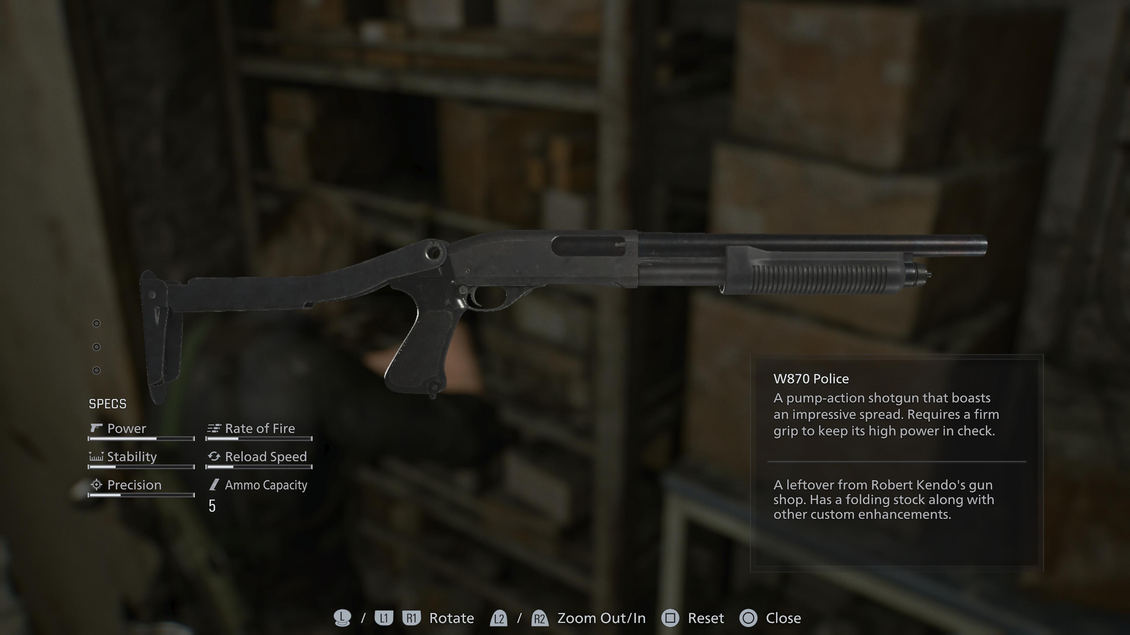 A pump-action shotgun that boasts an impressive spread. Requires a firm grip to keep its high power in check. A leftover from Robert Kendo’s gun shop. Has a folding stock along with other custom enhancements. As a relic from Robert Kendo’s gun shop, the W870 Police feels like a piece of Resident Evil history - loud, forceful, and unapologetically effective when things get messy.