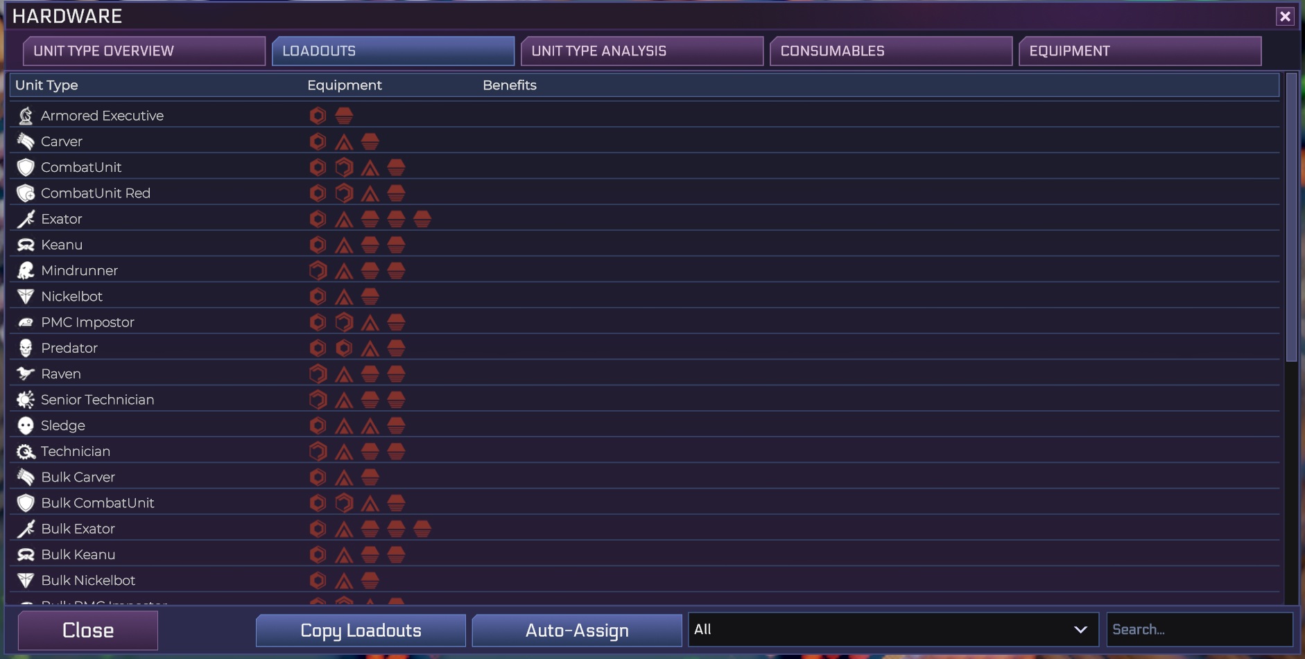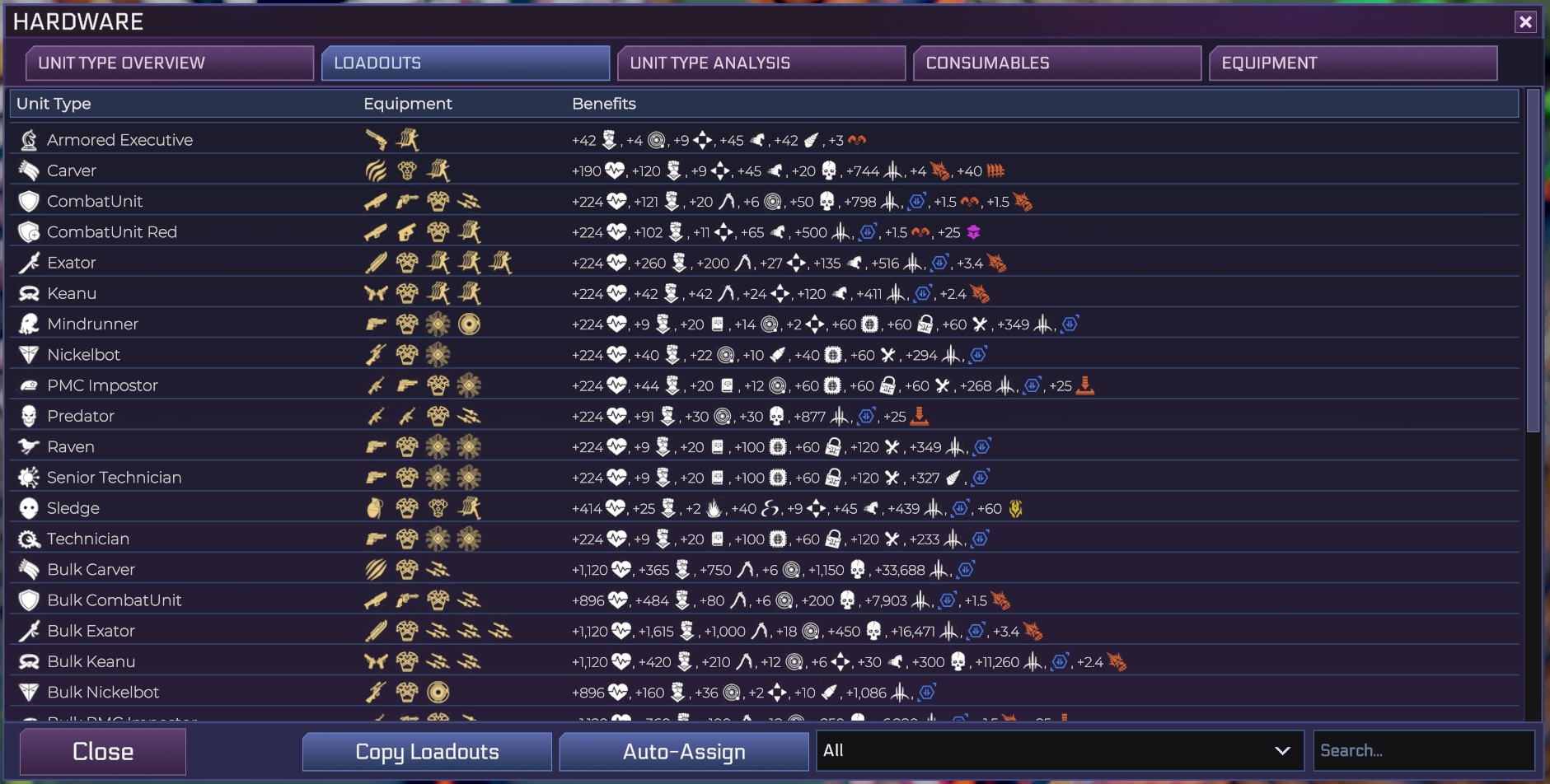 - Centralized View: There is a new loadout tab of the hardware screen. It shows a list of all of your units, and what their current loadouts are.