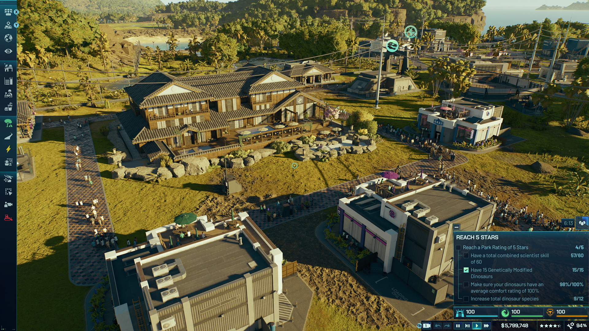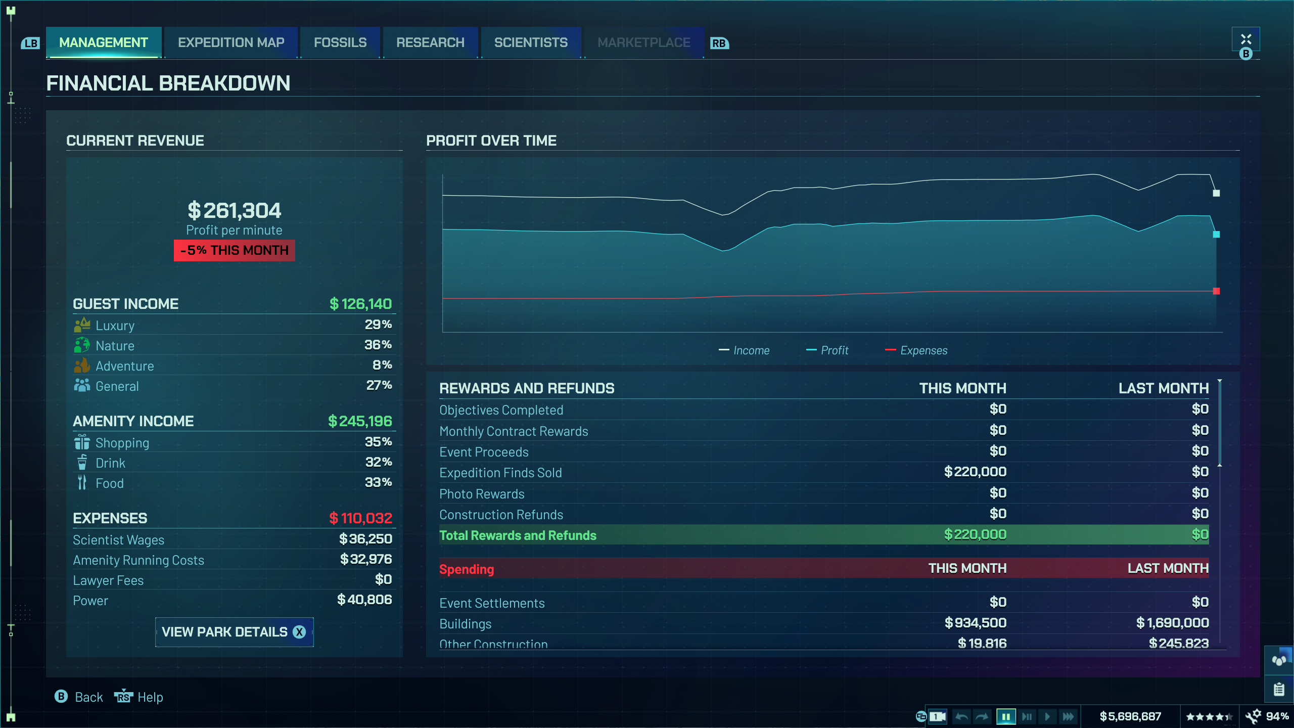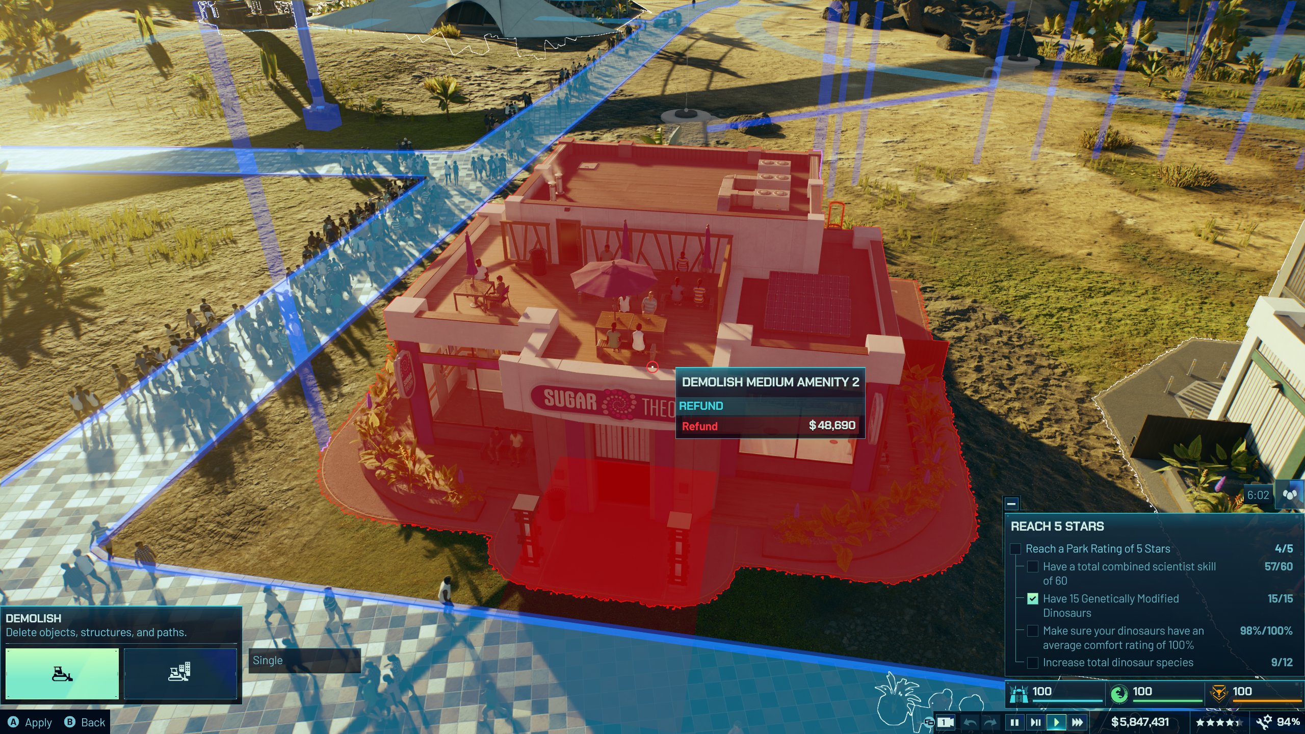 If you spend too long in the red, you’ll be kicked out of the manager role, essentially making it a ‘game over’ situation and forcing you to reload a previous save. To avoid this, you can sell off buildings you don’t need to gain some liquidity, but that also puts you in a difficult spot when it comes to keeping the parks running smoothly and won’t fix your income/expenses balance. Only sell buildings in Jurassic World Evolution 3 if you have a plan to make a profit right after (you can just pause the game at any time to evaluate the entire operation and check what’s bleeding cash). You can do so with the demolishing action.