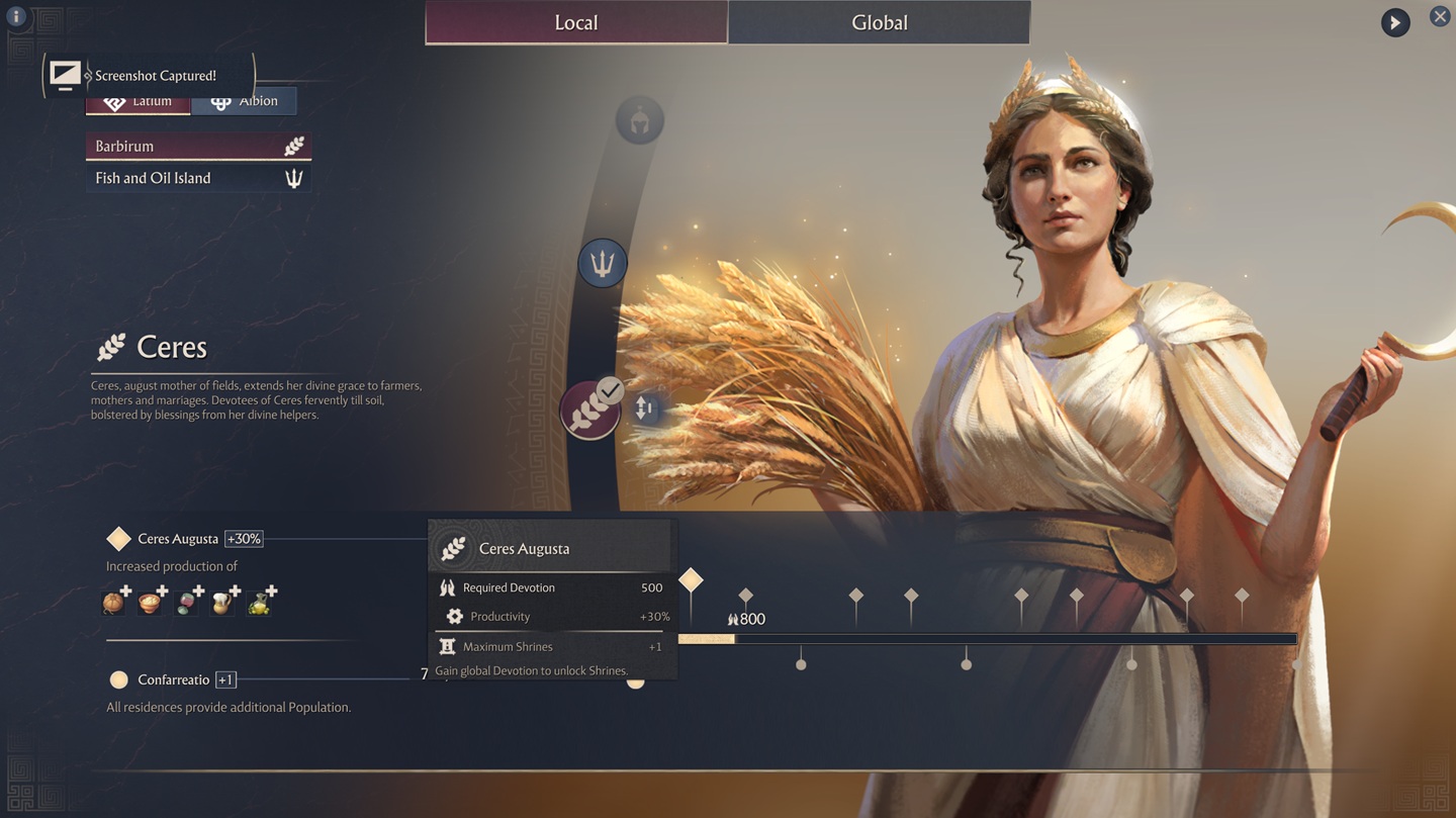 Over in Albion, my people prayed to Neptune, which made sure I gathered cockles quicker and decreased upkeep for ships. You can switch between deities at any time at the cost of resetting your Devotion and losing earned bonuses. Since you don’t start with all gods unlocked, you also need to research them through the tech tree.