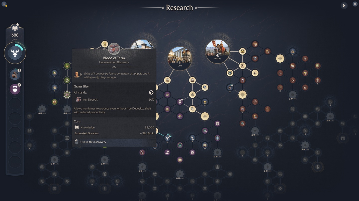 Another new addition in Anno 117: Pax Romana, the tech tree’s branches stretch decently far without overwhelming, being split into three categories – economic, civic, and military. The research options within unlock more than just the aforementioned gods, granting access to new buildings, upgrades for your trading posts and warehouses, new combat units, and improved area bonuses from structures.